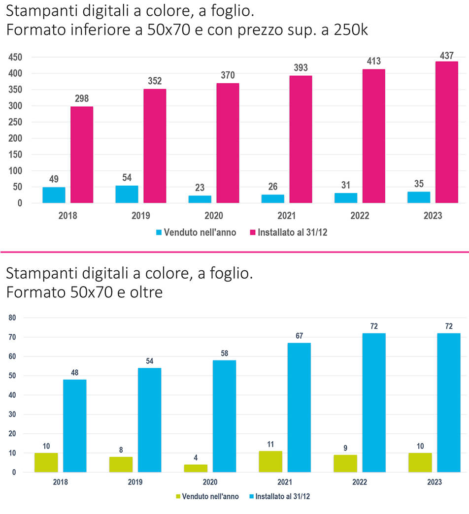 Scorrendo alcune categorie di questo segmento notiamo un costante calo delle macchine da stampa a colori, a foglio, nella fascia dedicata alle macchine con formato inferiore al 50×70 e prezzo inferiore ai 250.000 euro. È un sotto-segmento border line con le macchine dipartimentali da ufficio, considerate nelle analisi rilevate da ASSOIT, l’Associazione Produttori Soluzioni di Stampa, Digiralizzazione e Gestione Documentale. In questa classe di macchine i numeri di vendite e di installato sono importanti ma il trend negli anni si sta consolidando verso una riduzione dei numeri assoluti. È un fronte dove le vendite hanno una notevole incidenza nel settore dei rivenditori ufficiali.