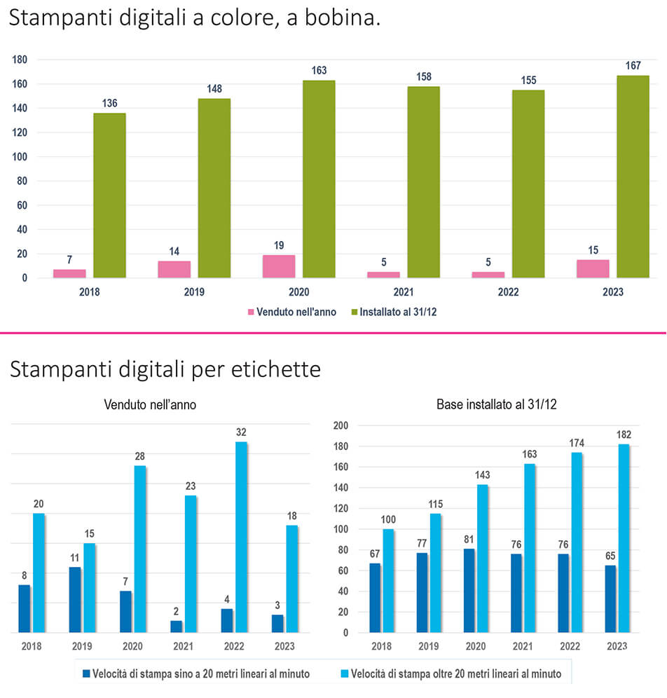 Il mercato delle macchine da stampa digitali per etichette rileva invece un continuo trend di crescita attorno all’8% anno su anno nell’ultimo triennio. È soprattutto la fascia di mercato delle macchine con velocità di stampa oltre i 20 metri al minuto che continua con regolarità a crescere, segno della richiesta di macchine maggiormente performanti in termini di produttività.