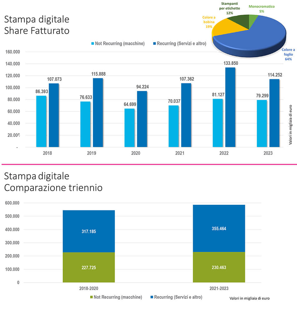 Sul fronte digitale la situazione vede una differenza rispetto a tutti gli altri segmenti. La parte preponderante del fatturato di questo segmento arriva proprio dalla componente recurring, frutto anche delle politiche commerciali dei fornitori che utilizzano, con nomi differenti e formule non sempre uguali, le proposte “pay per click” verso i propri clienti. Se invece guardiamo i risultati 2023 vs. 2022 è proprio nella parte definita recurring ovvero il Service, i consumabili e tutti gli altri componenti aggiuntivi che si evidenzia un decremento maggiore rispetto al decremento nelle vendite delle macchine da stampa.