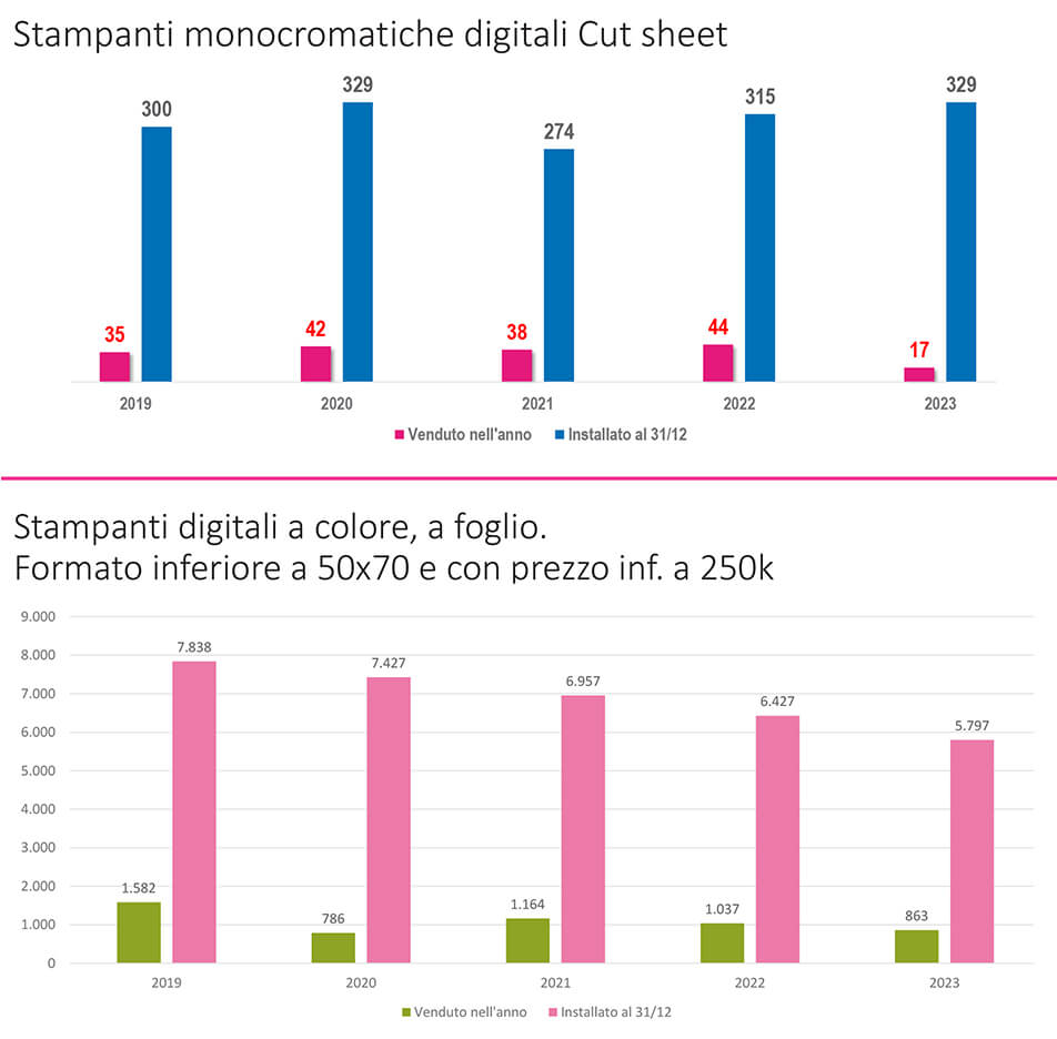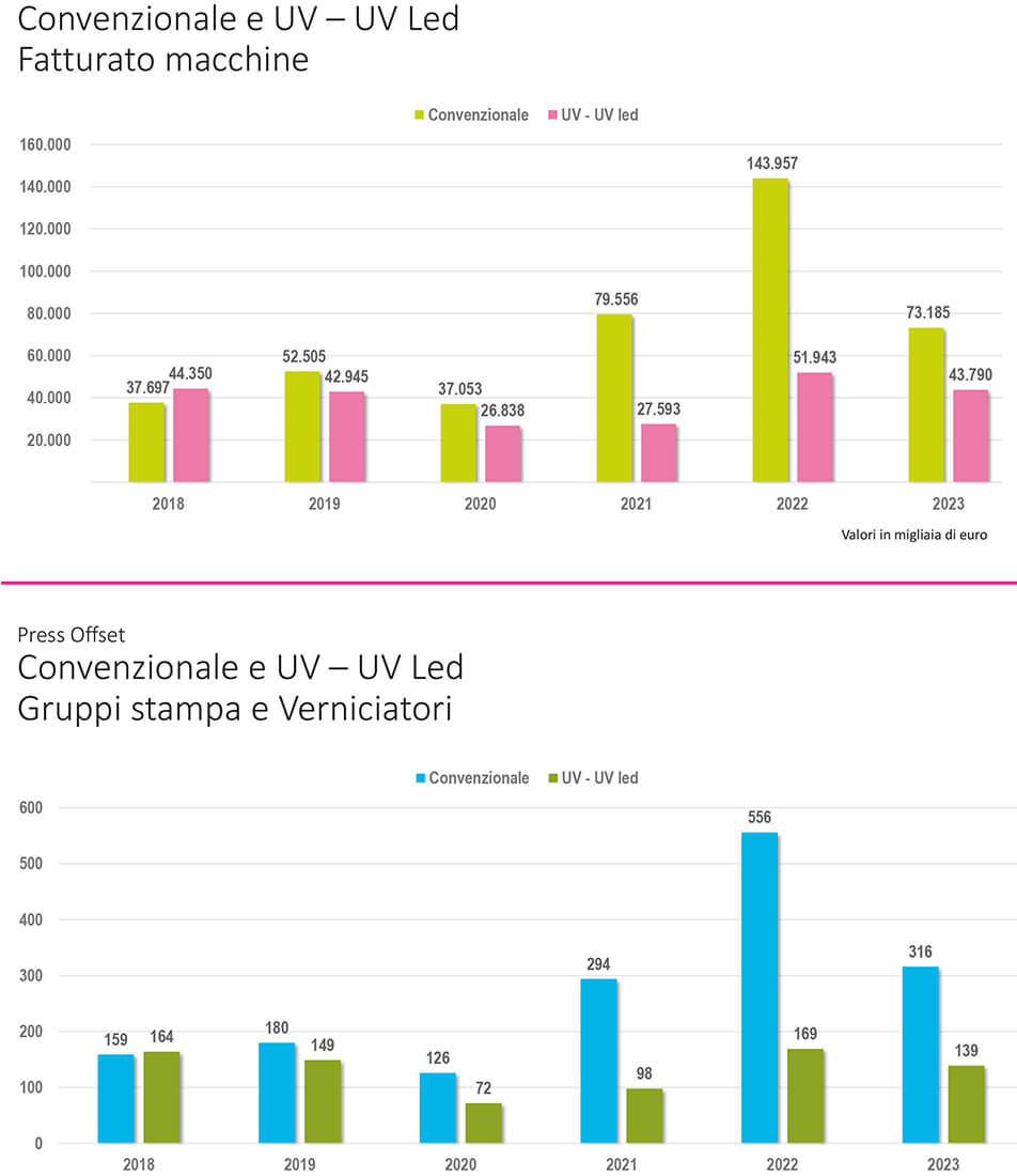 Sono dati fuorvianti. Il 2023 arriva a chiusura di un periodo di due anni precedenti dove il forte sostegno governativo dato dalle agevolazioni del Piano Nazionale Industria 4.0 aveva consentito un consistente aumento delle vendite, come non se ne vedevano da oltre un decennio. Ecco quindi che la necessità di avere una visione più allargata di questo mercato porta non solo dati più consolanti ma soprattutto veritieri. Paragonando i dati del triennio 2018-2020 con i dati del triennio successivo (2021-2023) vediamo che i due settori considerati hanno prodotto un risultato positivo del 27.2%, con una punta di eccellenza data dalle macchine offset, ovvero quelle che hanno avuto la perdita più significativa nell’anno appena trascorso, ma cresciute nel triennio del 74%.