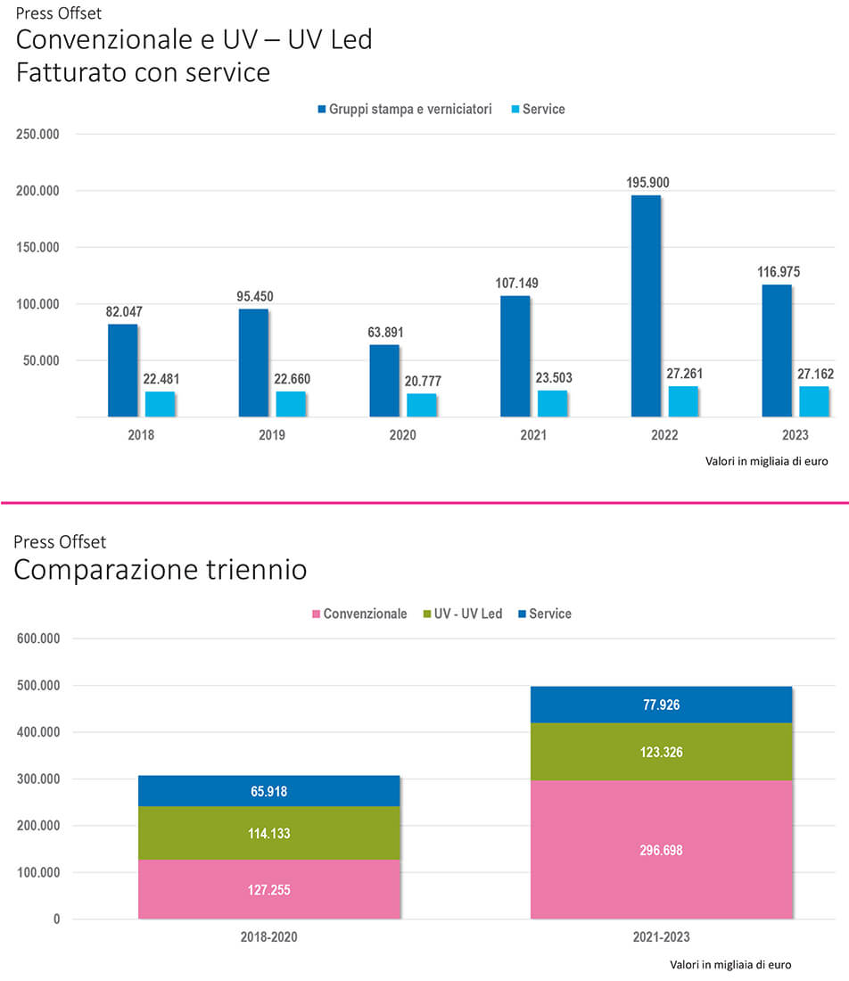 Entrando nel merito dell’anno 2023, sulla parte offset si può notare che le macchine da stampa convenzionale hanno subito il decremento maggiore (così come avevano avuto la crescita maggiore nell’anno precedente) mentre le macchine da stampa UV-UV Led hanno avuto una perdita molto più contenuta. Stabile infine la componente “Service” che rappresenta una parte ben consolidata in questo segmento.