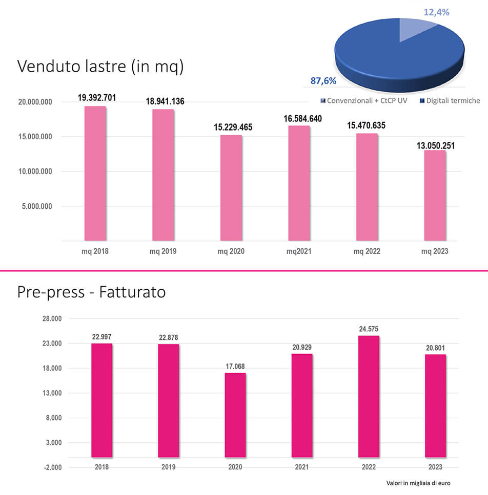 Partendo dai segmenti Lastre e Pre press, due sono le considerazioni anche per due mercati accessori per la stampa offset, dove l’Associazione ha una rappresentatività estremamente alta e può quindi, come per i due segmenti della stampa, essere autorevole nelle analisi. Il segmento delle lastre da stampa sta continuando, con qualche variazione negli anni, un calo fisiologico dei metri quadri di lastre venduti, indice di un ridimensionamento dei volumi di stampa che continua a toccare soprattutto il mercato del commercial printing. Nel 2023 si è infine scissa definitivamente la scelta tecnologica, dove le Case Madri si sono concentrate sulla vendita di lastre termiche, lasciando le convenzionali e le CtCP UV agli importatori dai mercati asiatici.