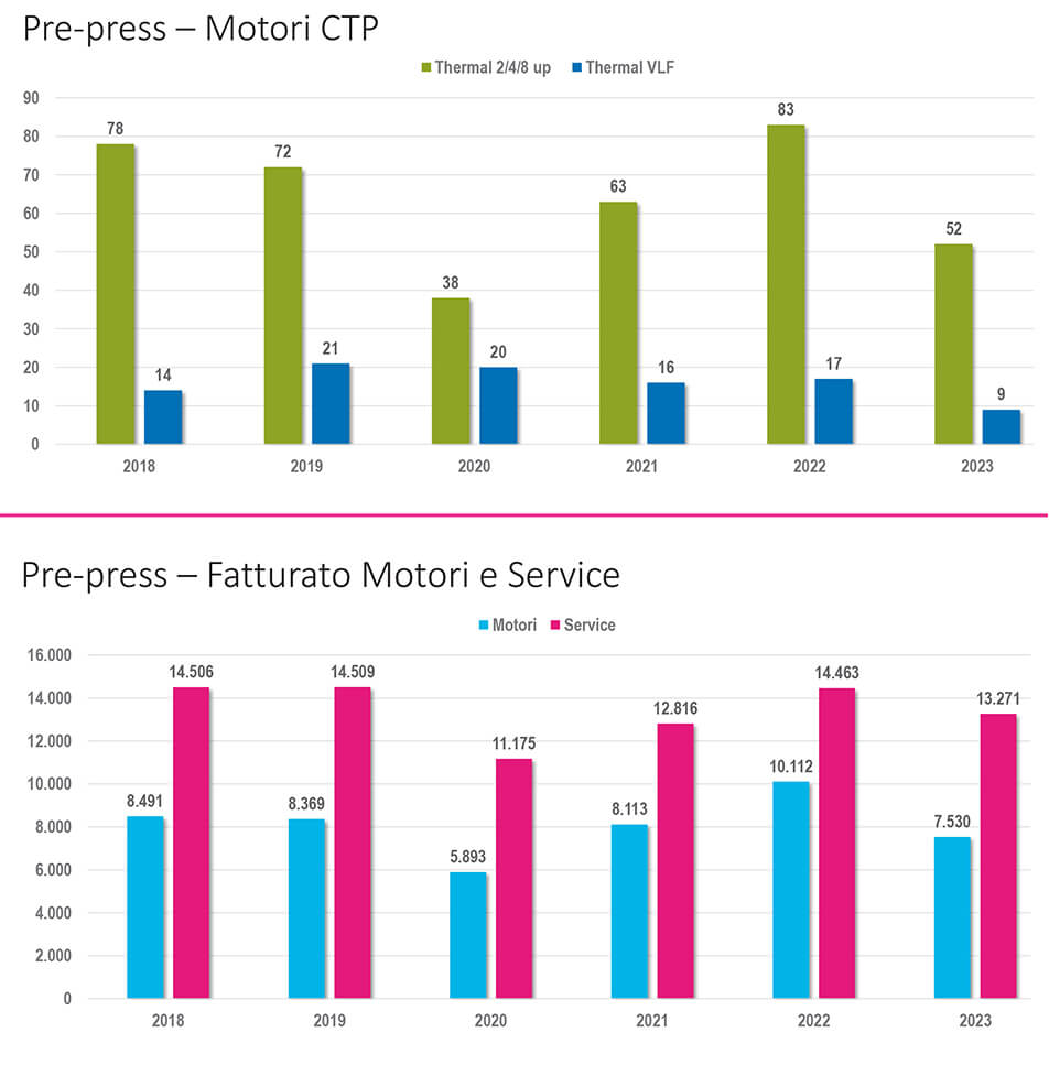 Per quanto concerne il segmento Pre Press Offset, questo è un segmento maturo, che vive anch’esso soprattutto di sostituzioni e, in termini di macchine, ha sostanzialmente seguito gli andamenti del segmento Offset. In questo segmento la parte dominante è data dalle macchine 2/4/8 up mentre i VLF hanno toccato il livello di vendite più basso dal 2018. Anche in questo segmento, la componente Service del fatturato è ormai da molti anni preponderante.
